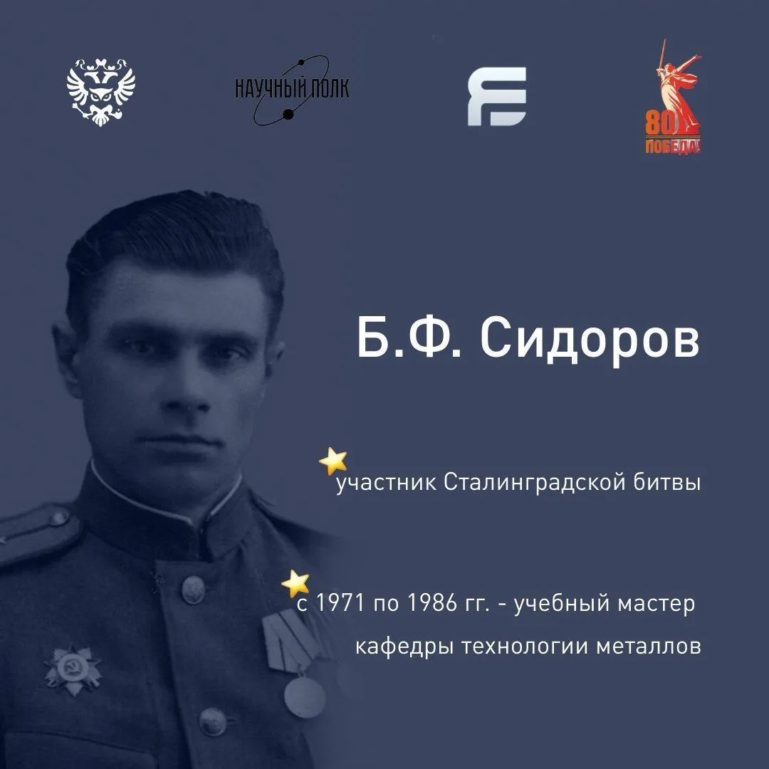 ⭐️ После госпиталя Борис Федорович Сидоров продолжил службу в Кагановичском райвоенкомате г. Ярославля, работал на автозаводе. В нашем вузе трудился учебным мастером кафедры технологии металлов с 1971 по 1986 гг.