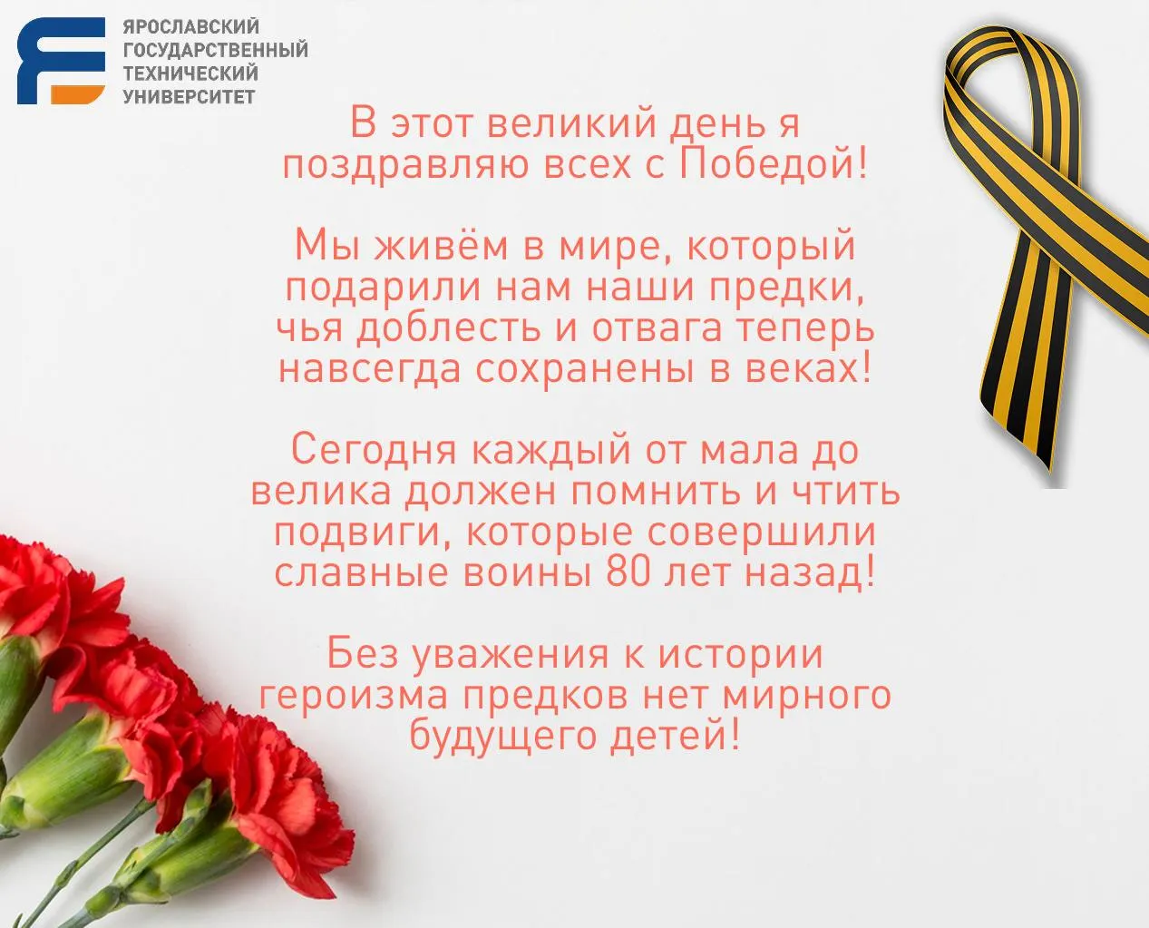 Ректор ЯГТУ Елена Степанова поздравляет с 80-летием Победы в Великой Отечественной войне.
