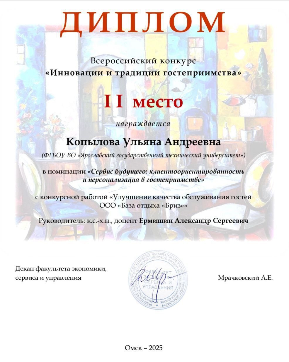 «Конкуренция на конкурсе была высокая: всего приняли участие 133 человека из 24 городов и населённых пунктов России. На конкурс Ульяна Андреевна представила научно-исследовательскую работу по улучшению качества оказания услуг гостеприимства в одной из баз отдыха Ярославского региона. Новизной и оригинальностью предложенных в работе решений являлось то, что они основаны на применении процессного подхода и других принципов и ключевых инструментов менеджмента качества и проектного управления для результативной и эффективной организации процесса взаимодействия с гостями базы отдыха. Автором разработаны программы лояльности и концепции персонализированного сервиса посредством внедрения CRM-системы, что даст компании возможность выделиться на фоне конкурентов, увеличить доходы и укрепить свои позиции на рынке услуг в сфере гостеприимства», - рассказал Александр Сергеевич.